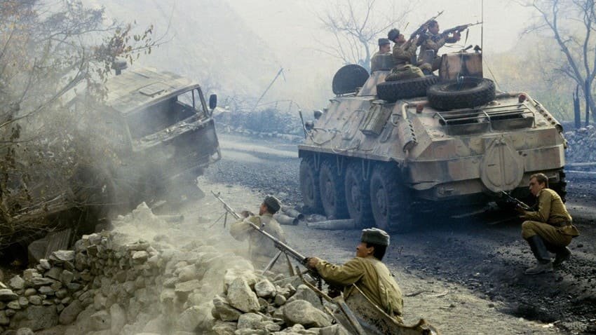 Soviet soldiers firefight Afghanistan war BTR combat ambush